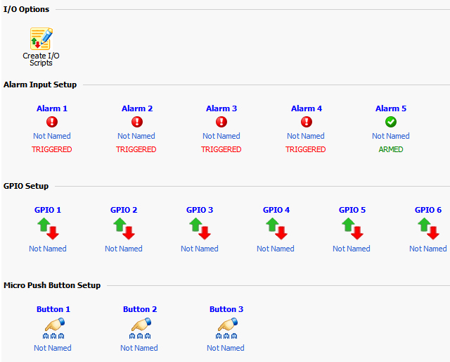 Below is a screen shot of the RMS-300 I/O setup page for GPIO 1. GPIO pins can be configured to be 3.3 volt Inputs or Outputs. Use these pins to control any manner of devices, or sense condition changes and react with alerts or scripts.