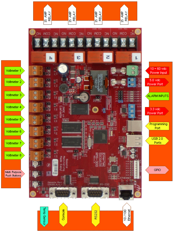 Four 15A Latching Relays. 8 Isolated Voltmeters.