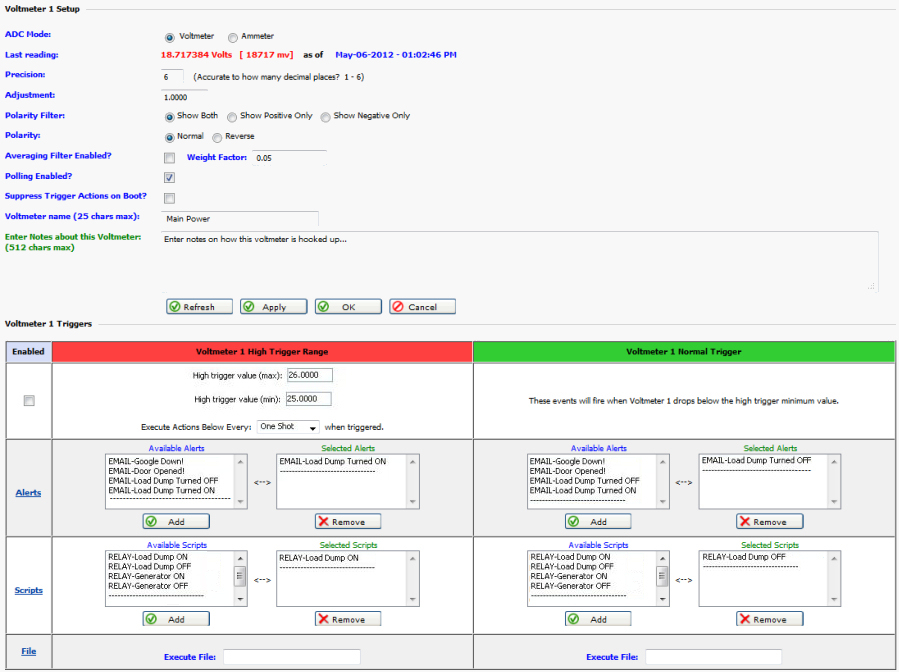 The "Suppress Trigger Actions on Boot" check box is used to stop actions from happening when the RMS-300v2 board is warm or cold started, or when settings are changed. Each voltmeter has a High, Normal, and Low trigger range. Each trigger range has a maximum and minimum value. The range in between the maximum and minimum value acts like a dead band area. Triggers can be set to fire alerts or scripts when the voltage is either too high or too low. The High Trigger is used when the voltage rises above the High Trigger maximum value. The Normal Trigger is used when the voltage falls below the High Trigger minimum value. The "Execute Every" box is used to select how often the condition should be tested and acted upon. Each voltmeter trigger can also execute a custom file stored on the RMS-300v2 board.