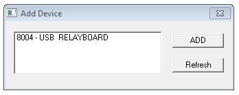 When starting the client program for the first time, it looks to see if a board has previously been connected. If not, the add device dialog box pops up. This list is automatically populated with however many USB Relay boards that are found to be connected to the host. Each USB Relay board is programmed with a unique identifier. The "Refresh" button will re-poll the USB port and find any units plugged in.   NOTE: Windows Vista and Windows 7 users may have to run the client program as Administrator.