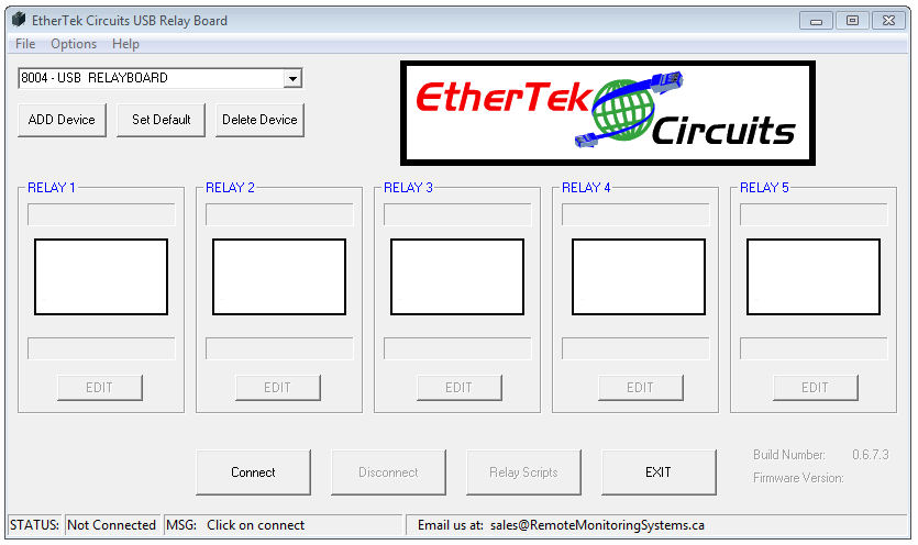 If the "Add Device" dialog box is closed without selecting a device, the main program will still open, however, a device will still need to be added in order to poll information. To add another device, click the "ADD Device" button. If there are multiple USB Relay boards in the list, you may make one default (shows up in the list box first) by selecting the "Set Default" button. If at any time you wish to remove a device, have the desired device selected in the drop-down menu and click the "Delete Device" button.