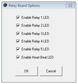 To disable LEDS for each realy and the "Heartbeat" LED, simply uncheck the corresponding check box and then click the OK button. The LED options are preserved even when the USB Relay board has been power cycled.