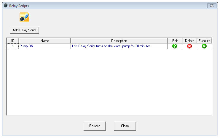 Relay scripts are made up of simple commands that control the relays. Complex relay actions can be performed to control your equipment. The screen shot below shows the Relay Scripts dialog box. This dialog box shows the list of current relay scripts stored in the database and provides a way to execute, edit, and delete them.