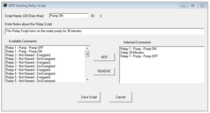 Relay scripts are built using available comands from the left box and adding them to the selected commands on the right.