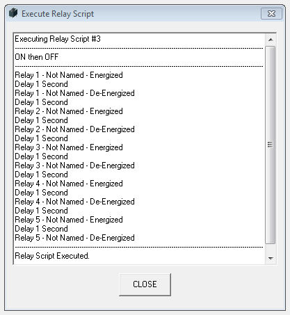 To execute a relay script, double click on the green execute button on the Relay Scripts dialog box. The screen shot below shows a relay script executing commands.